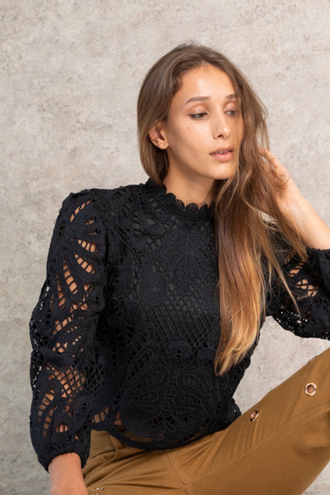 Blusa confeccionada en encaje cluny. Con un diseño de inspiración barroca, esta prenda destaca por sus mangas abullonadas tres cuartos y cuello alto con terminación festoneada. Prende con cierre en la espalda. Ideal para looks de día o de noche. Combínala con jeans, pantalones sastreros o faldas para un outfit de impacto.