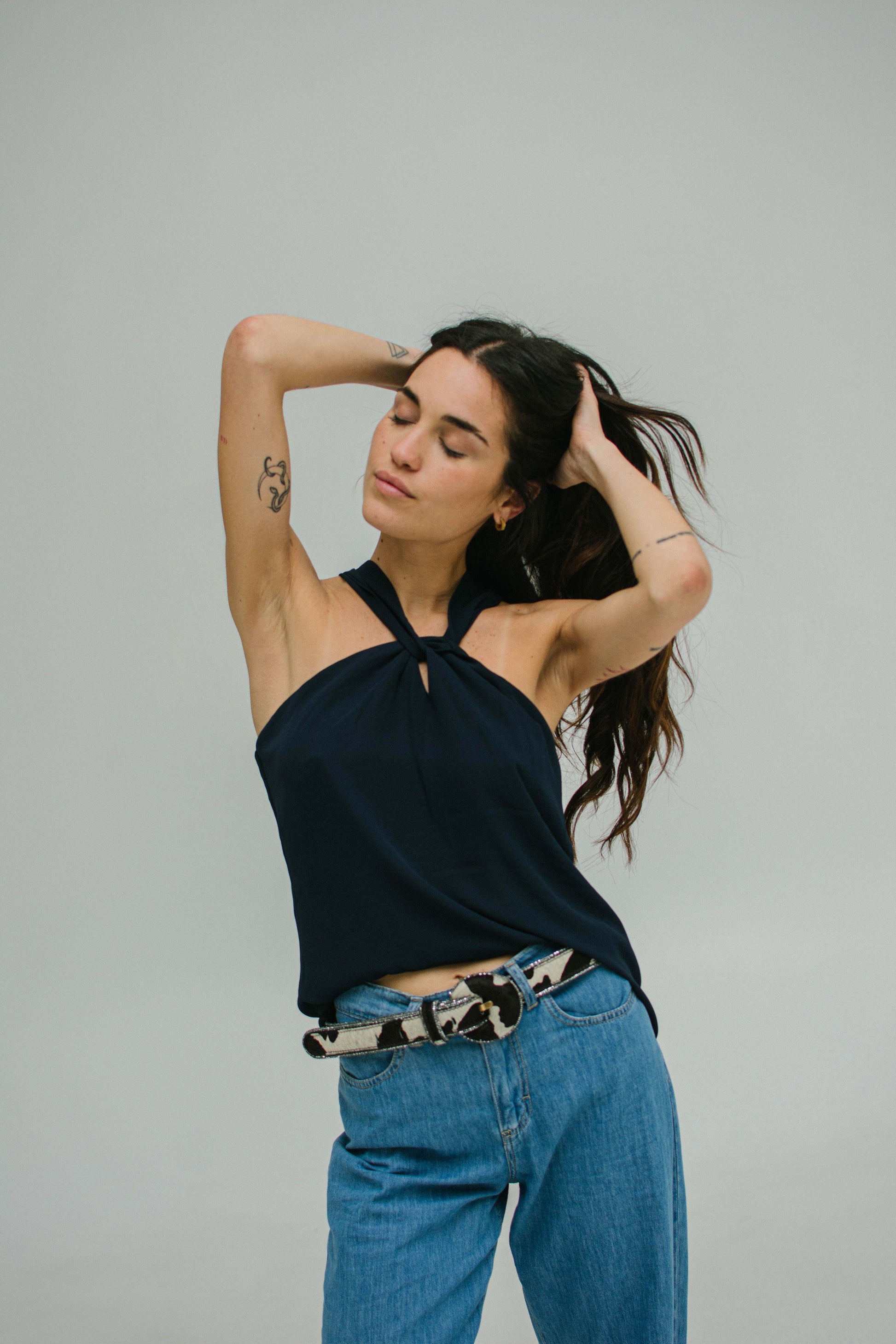 Blusa de crepe fluído con nudo en escote. Prenda para diversos looks!