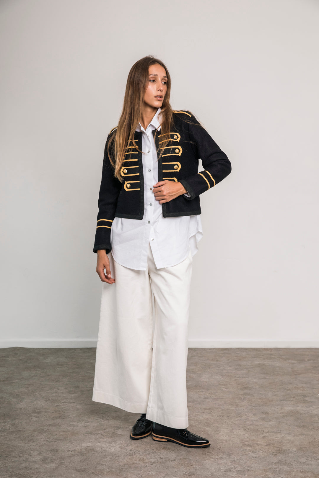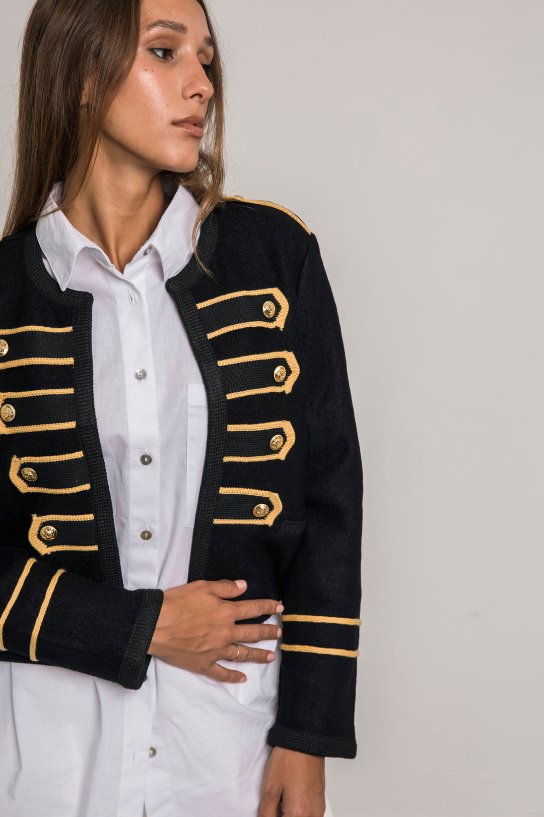 Confeccionada en paño, presenta detalles dorados bordados y botones metálicos que realzan su estilo distintivo. Su corte corto y entallado aporta un aire moderno y femenino.