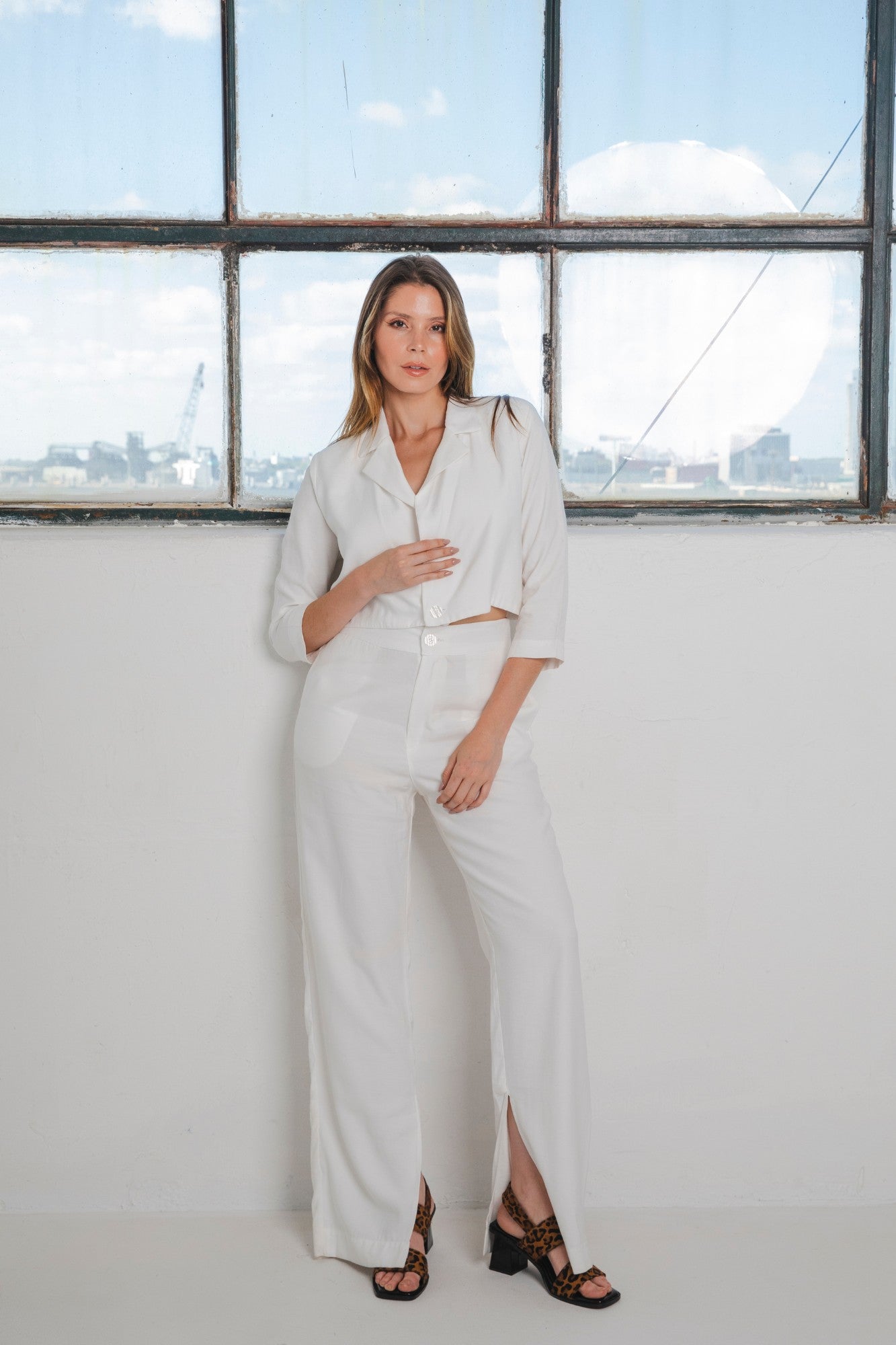 Conjuntos dos piezas. Blazer a la cintura manga 3/4 y pantalón wide leg con tajo lateral en dobladillo.