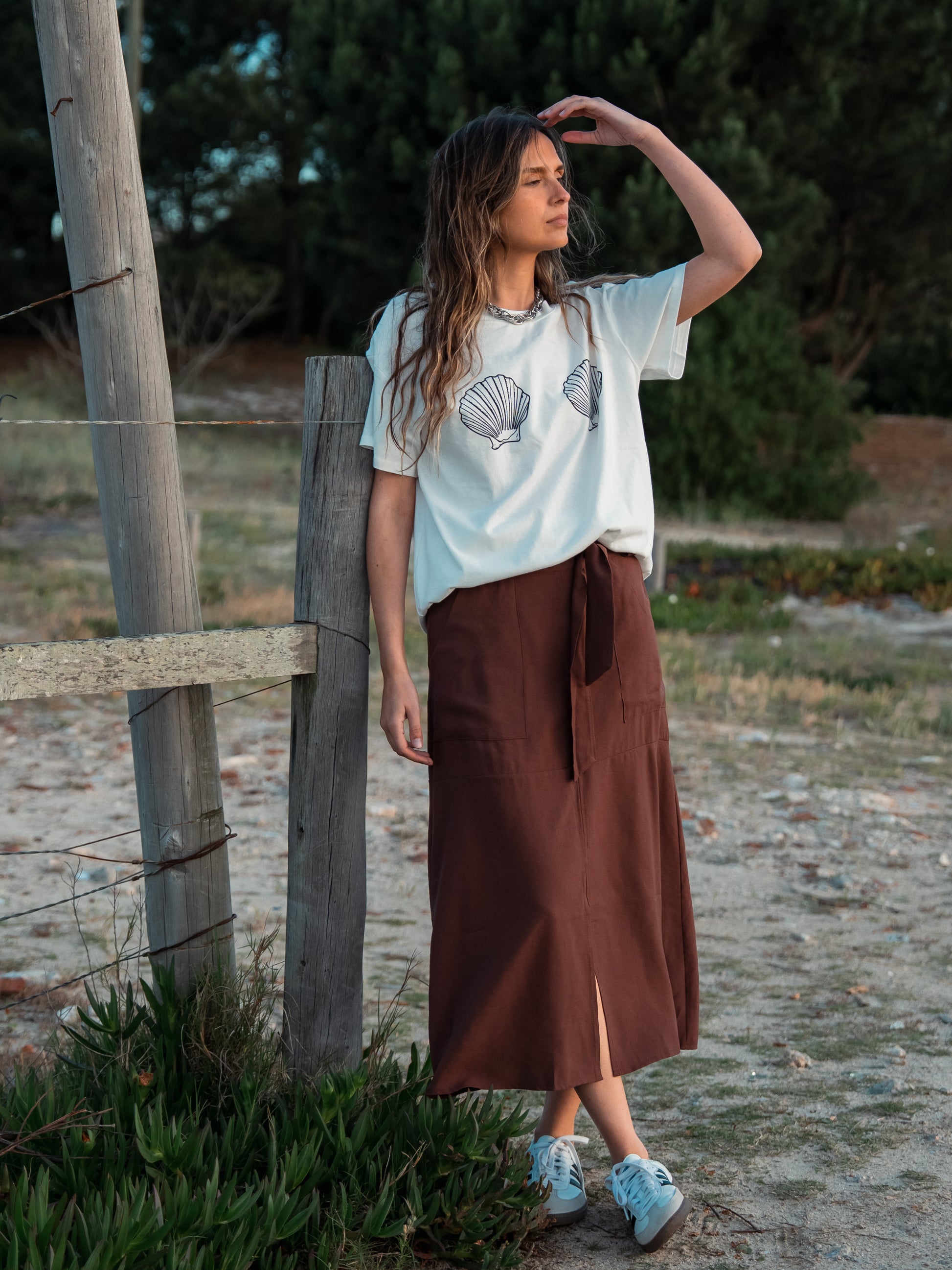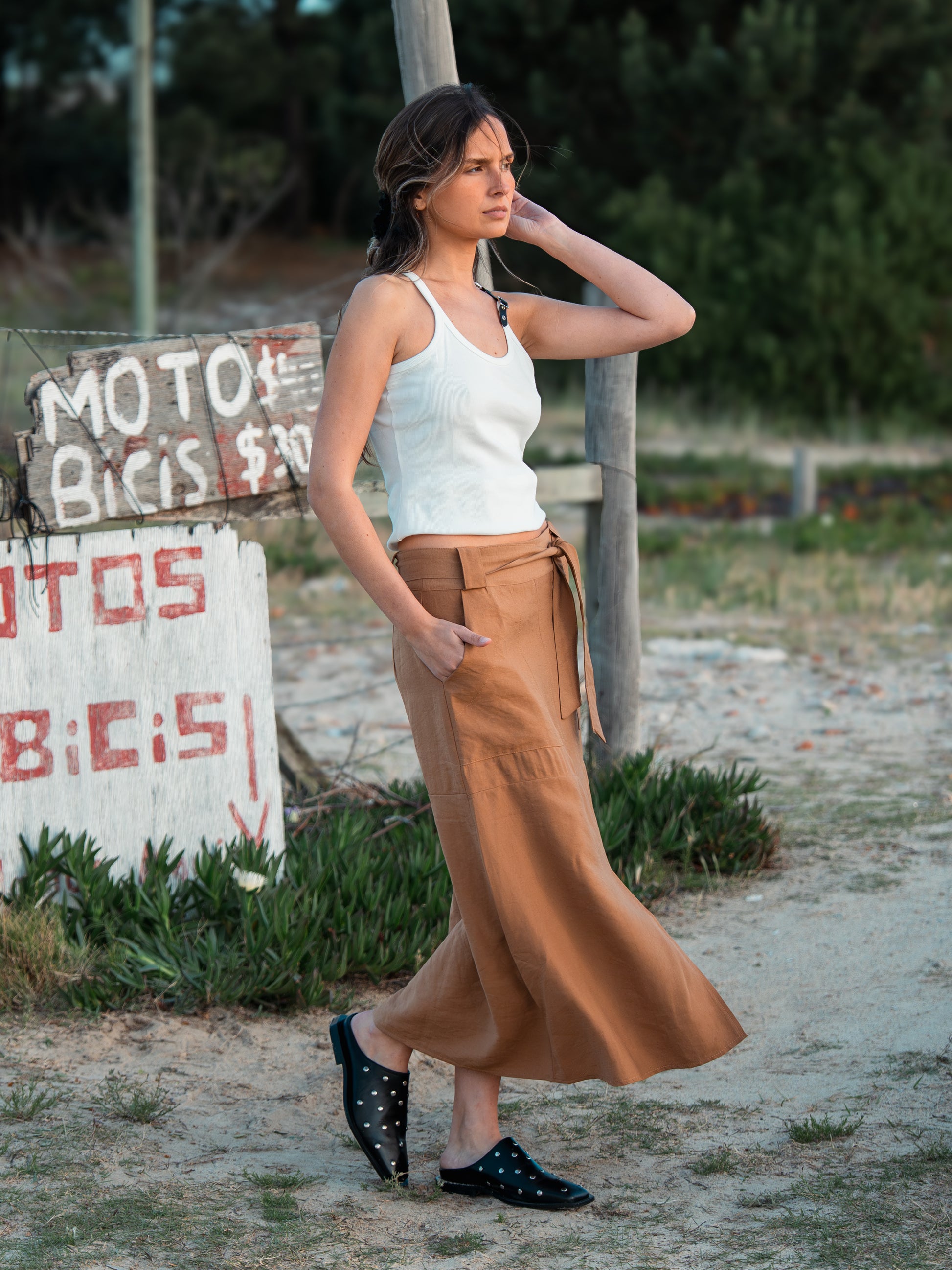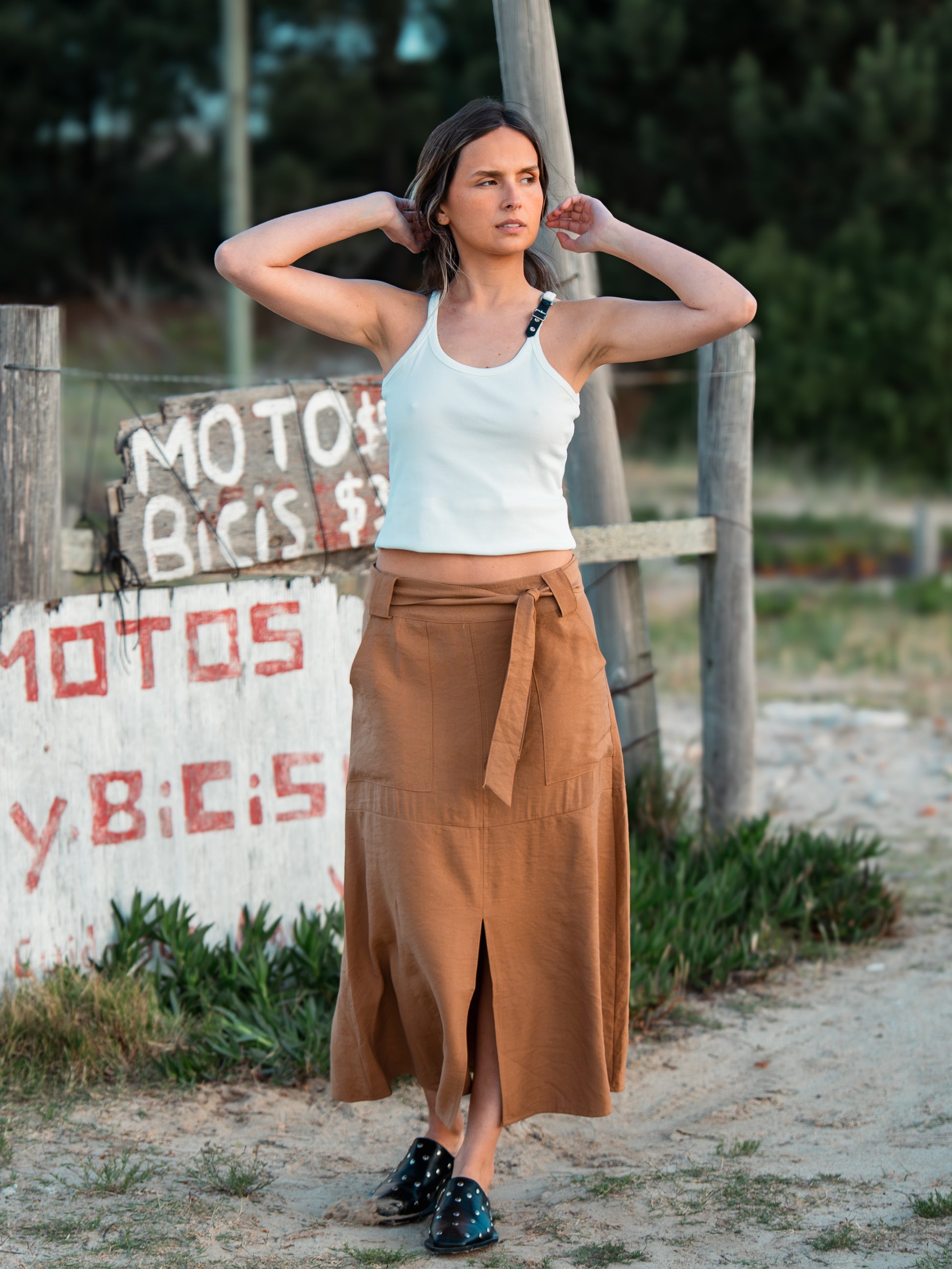 Falda midi con lazo y bolsillos laterales. Presenta tajo frontal que le da fluidez a la falda.