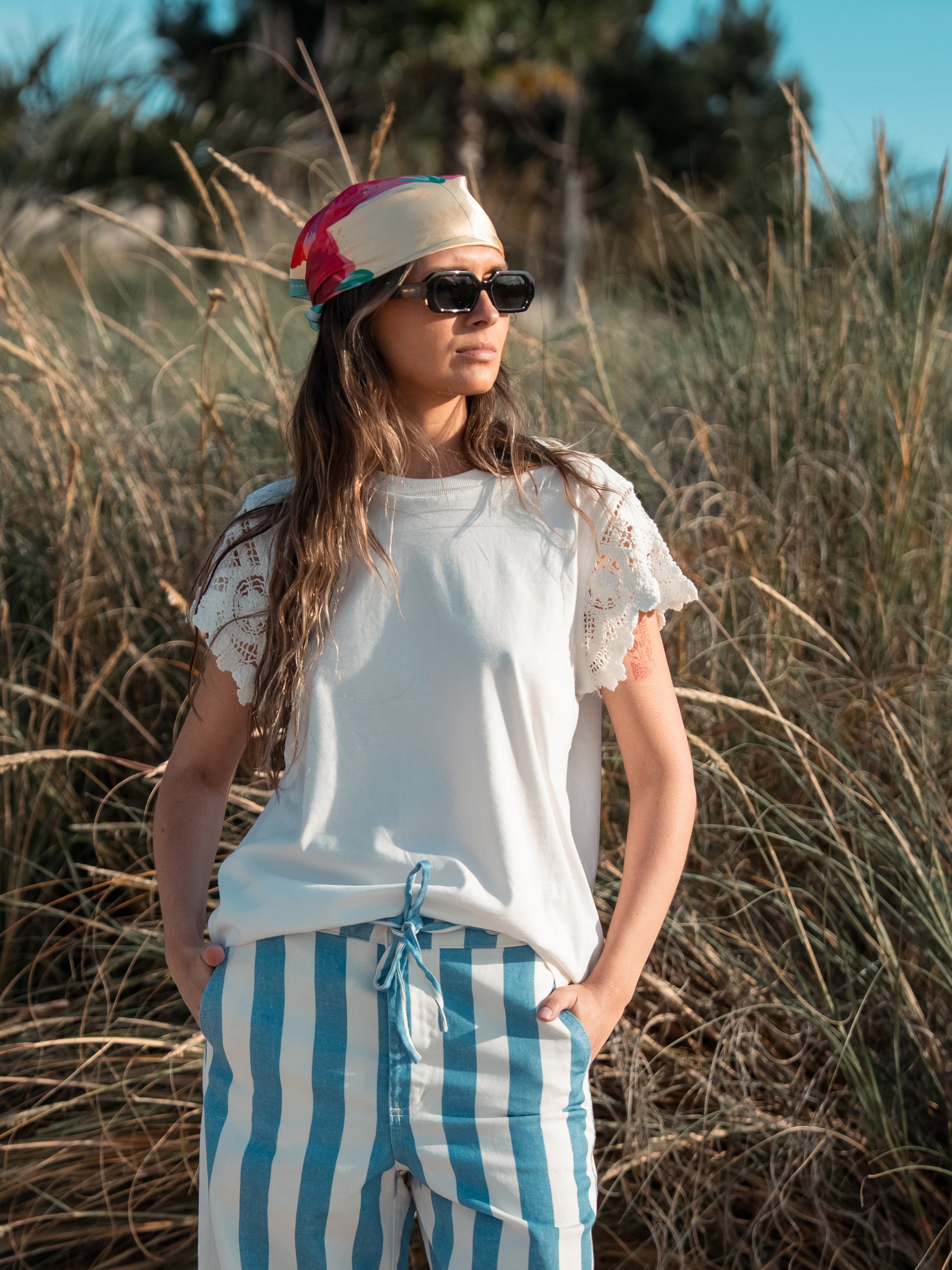 Remera de algodón manga corta con escote a la base y mangas en crochet.