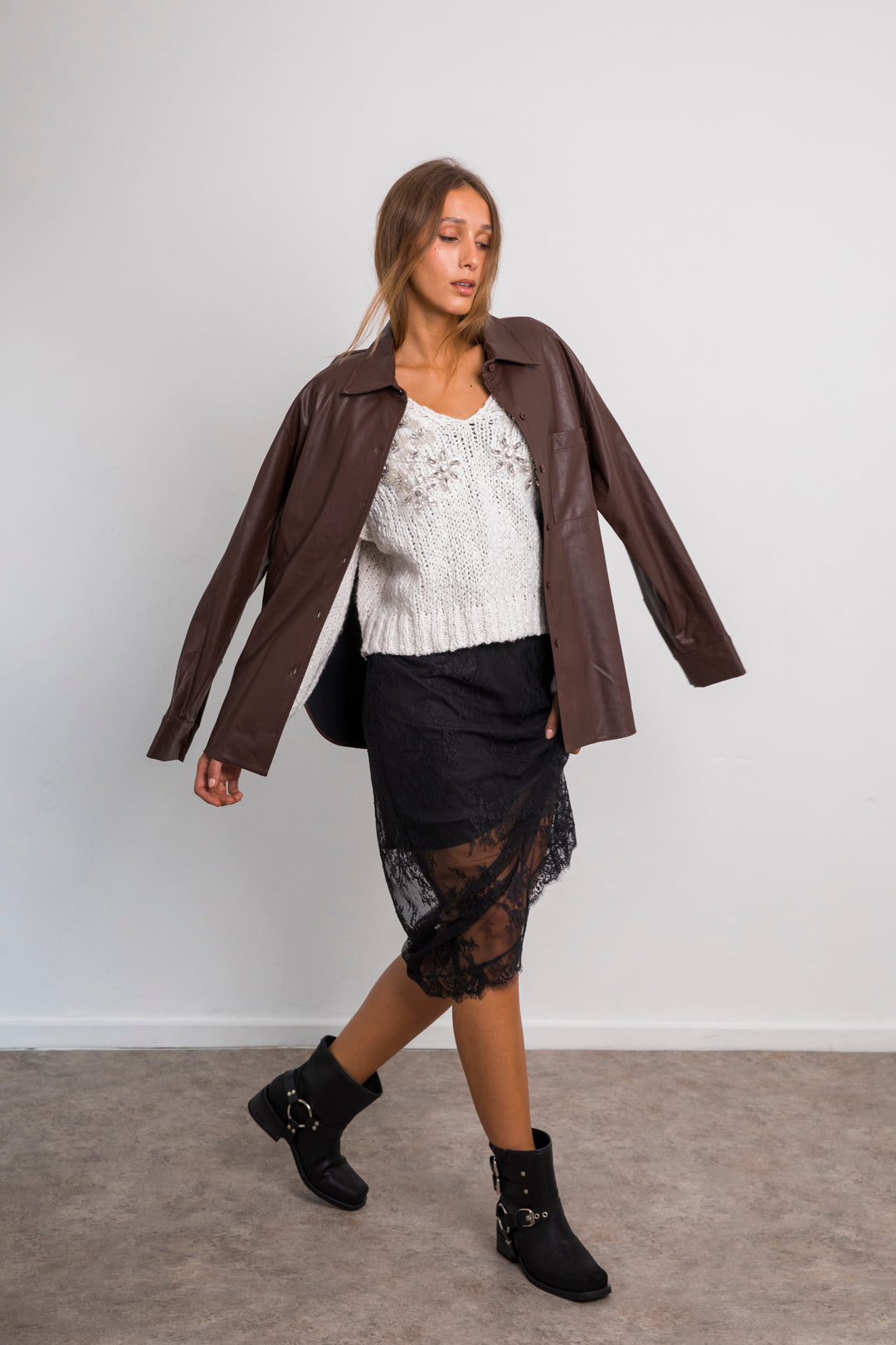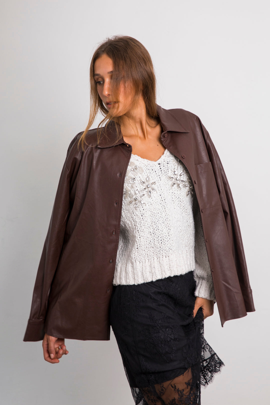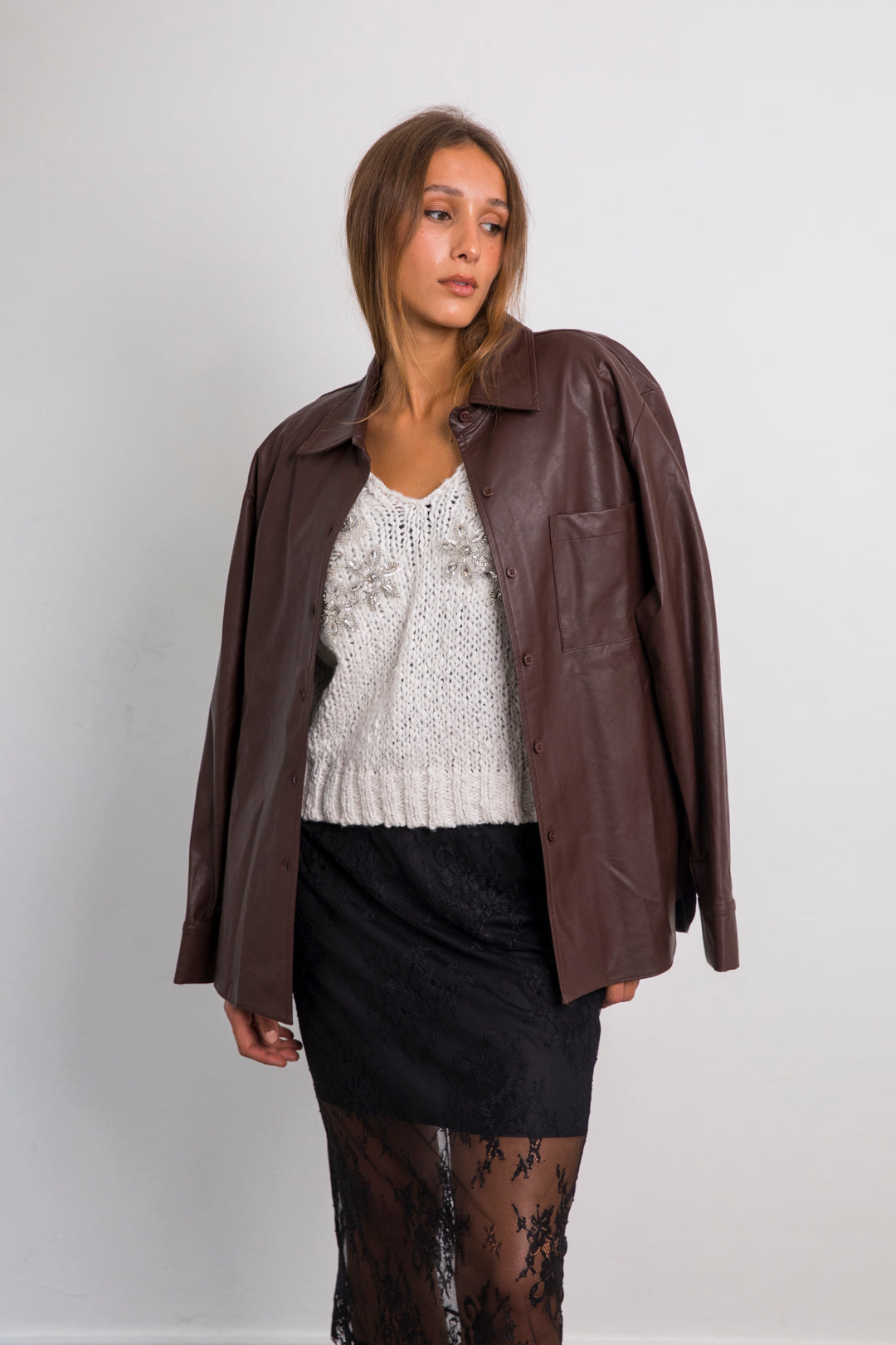 Camisa oversize de cuerina, ideal para sumar estilo urbano y sofisticación a cualquier outfit. Con estructura relajada y botones al tono, funciona tanto como camisa o como sobrecamisa liviana.