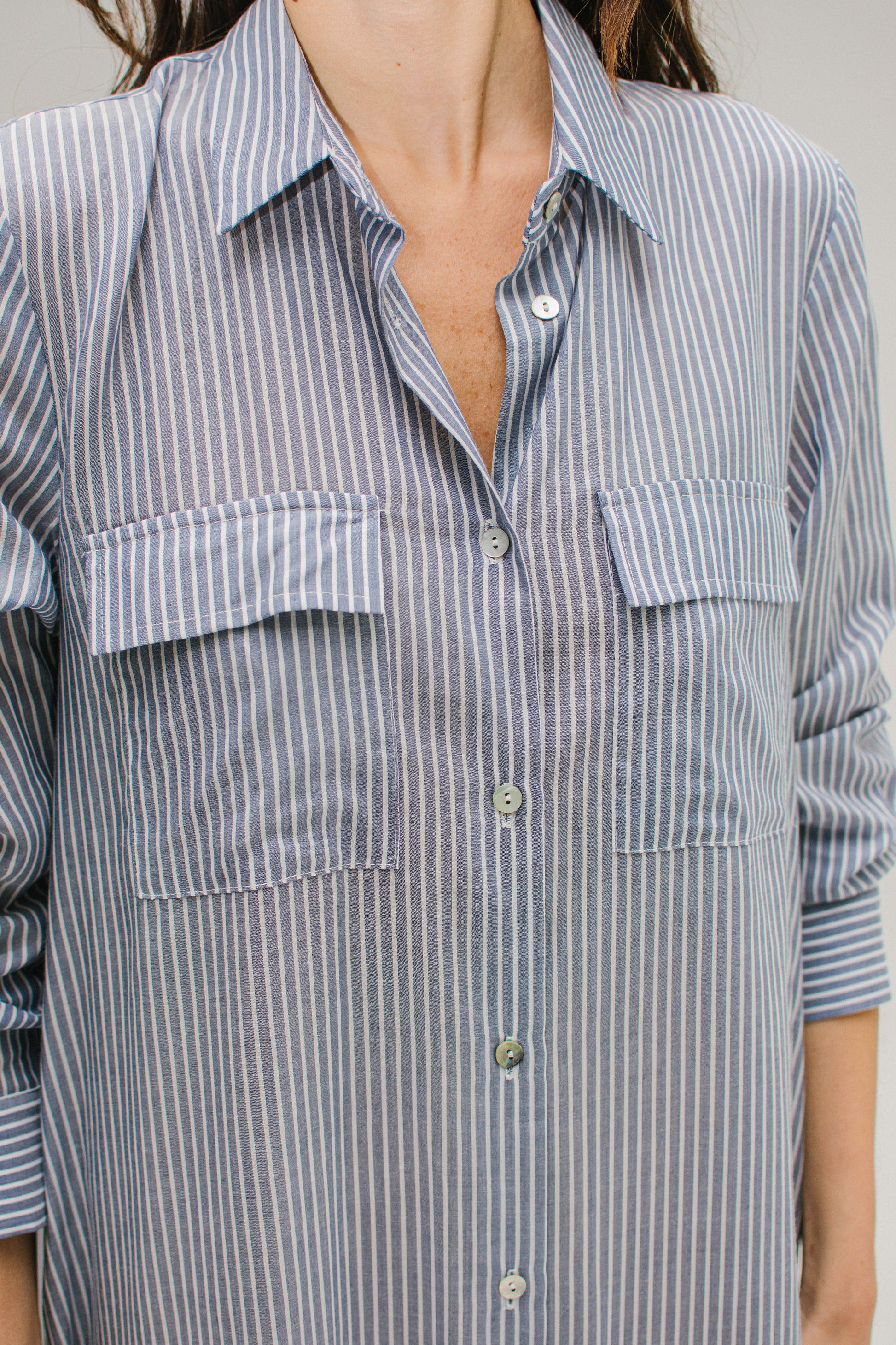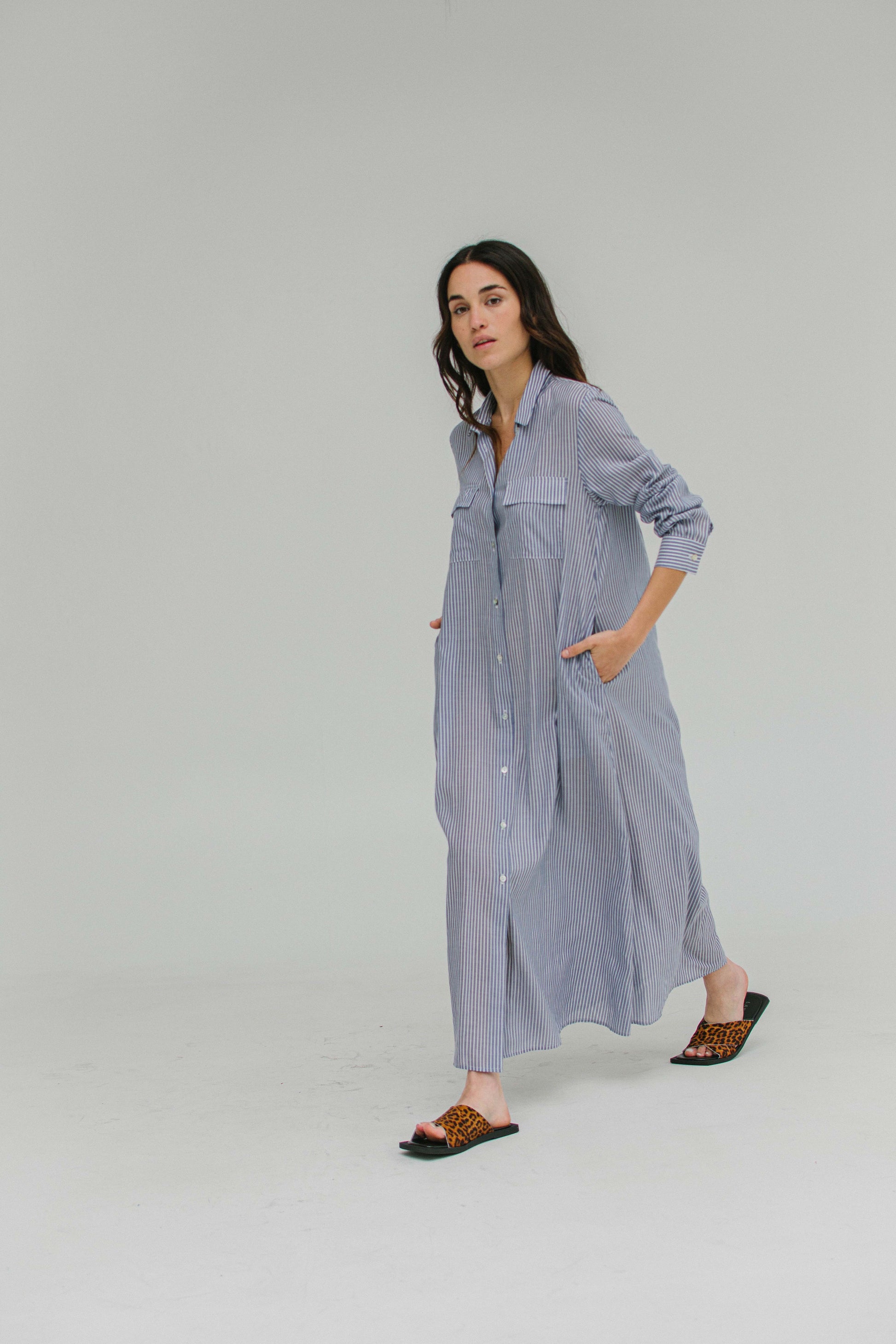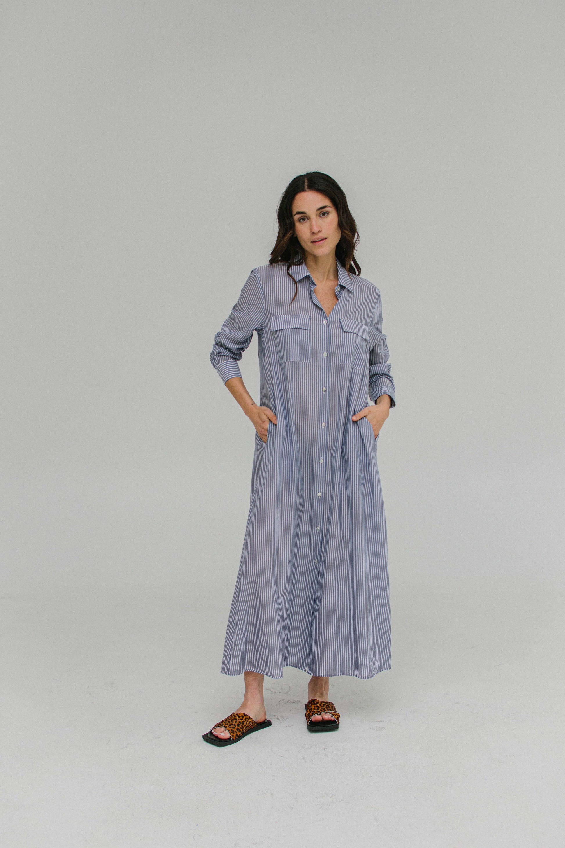 Vestido de lino tipo camisero largo. Prende con botones.